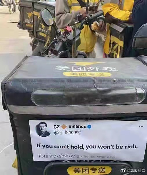 For a bit of light humor, an image was circulating of CZ’s famous Tweet “If you can’t hold, you won’t be rich” stuck to the back of a Meituan food delivery vehicle. Meituan delivery is often memed as a low-paying form of employment that the crypto community members could be forced to return to when the industry is suffering, similar to McDonald’s in the west. It also pokes fun at a famous orange vehicle driven by an early Bitcoin whale in China that has the same message on the side door.